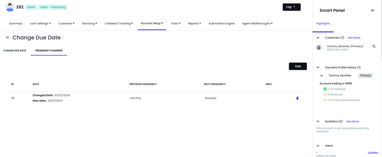 We’ve added the option to change payment frequency in addition to changing the due date on a loan account. Previously, only the due date could be edited. Now, the frequency at which payments come due can also be changed. For example, if you wanted to adjust an account to have weekly payments for one month, you can now accomplish that with this new feature. This page is also available as a destination within Agent Walkthroughs.